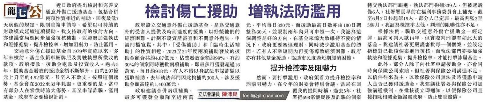 我支持政府檢討和完善交通意外傷亡援助 基金,亦建議當局應同步加強覆核機制, 並透過加強執法和證據蒐集,提升檢控 率,增加阻嚇力,防止濫用。