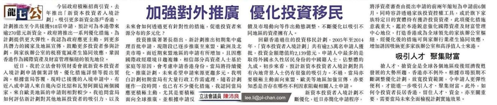發言支持,希望當局積極對外宣傳推廣,並對有意遷冊來港的公司 予以適當協助,提供全面資訊或便利安排,方能揮發此制度的優 勢,鞏固香港國際金融中心。