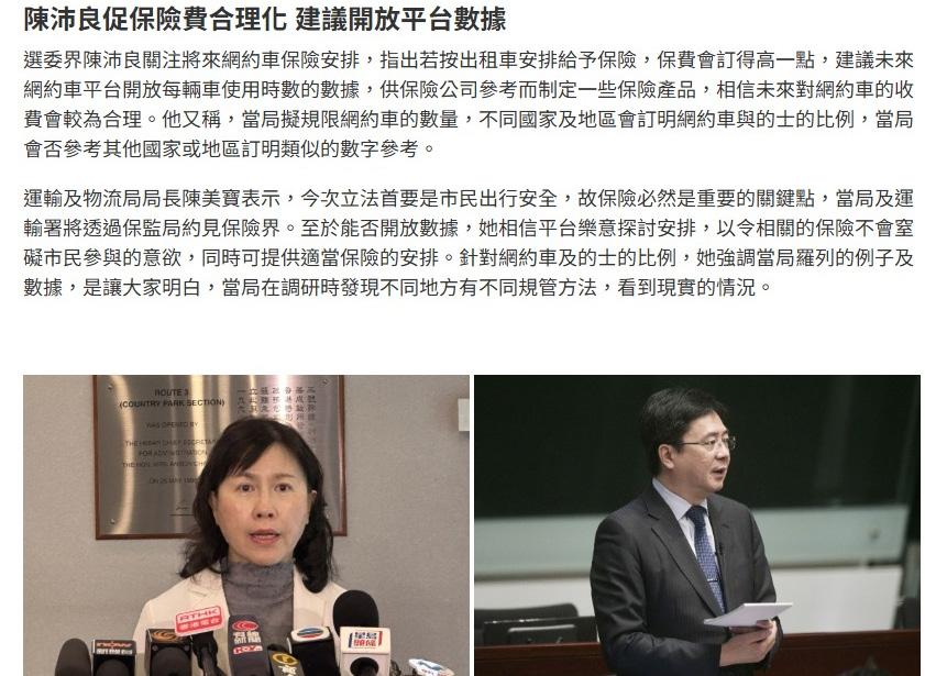我關注網約車保險安排, 指出若按出租車安排給 予保險,保費會訂得高 一點,建議未來網約車 平台開放每輛車使用時 數的數據,供保險公司 參考而制定一些保險產 品,相信未來對網約車 的收費會較為合理。