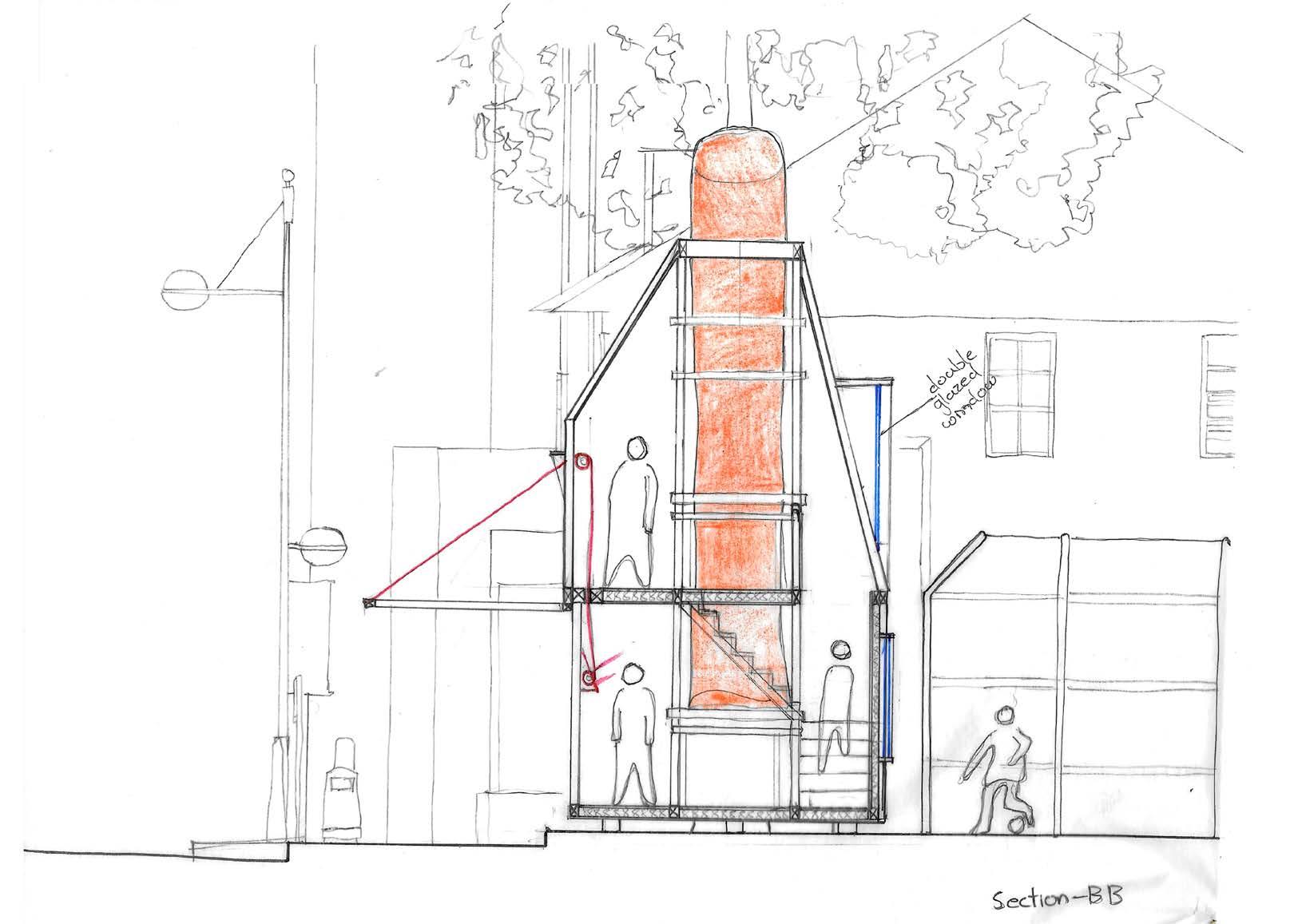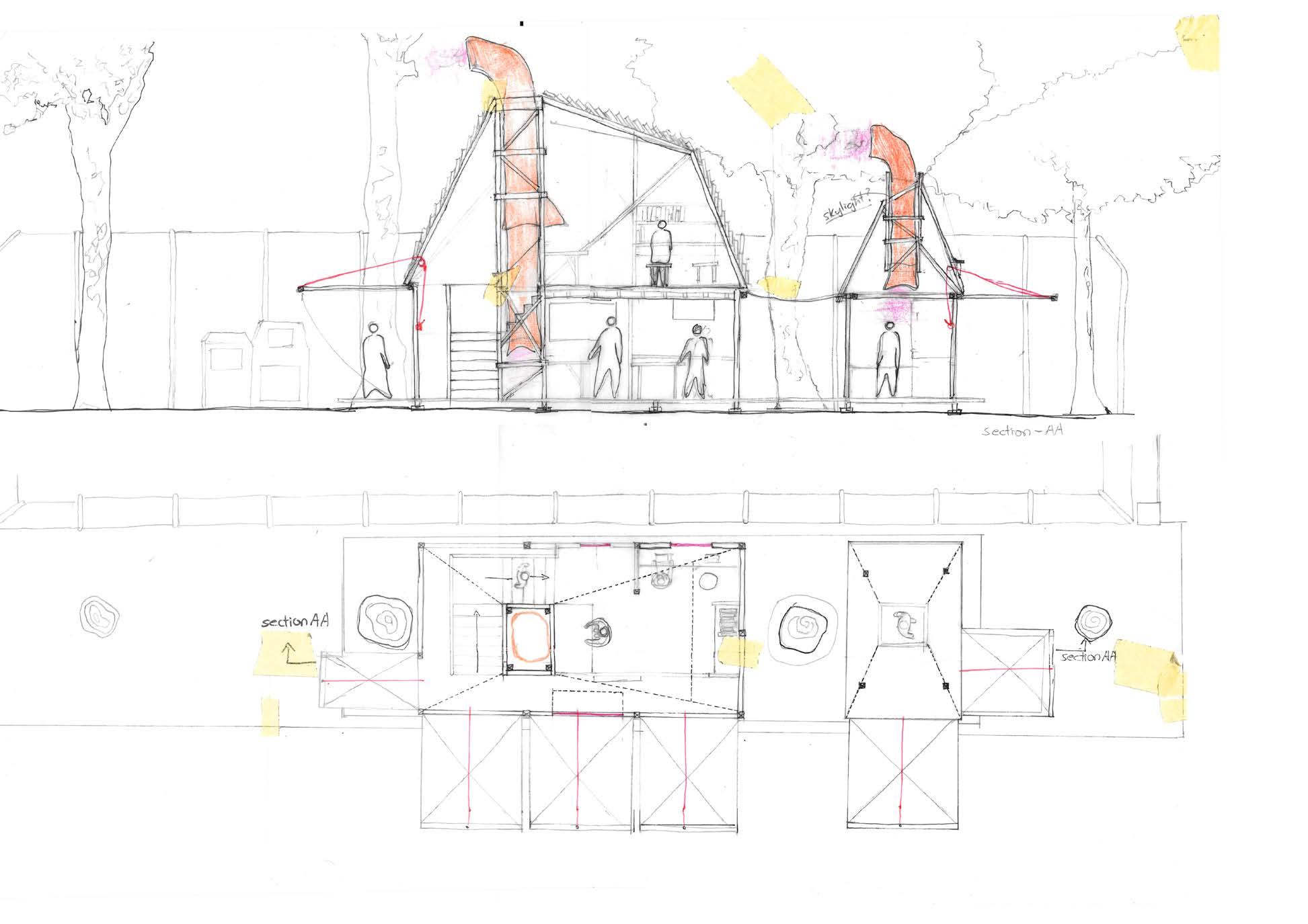 Chalton Street repair Cafe aims to promote sustainable practices. Situated within the residential heart of Somers Town, residents are encouraged to bring disused or broken electronics to be repaired instead of disposal. The design takes inspiration from the initial Fragment. For example the plastic bottle shutters are reimagined as roofing tiles, providing a unique translucency. The pulley leaf system is incorperated as a fully permeable wall system. Each wall panel opens as an individual shutter, merging the spaces with the street.