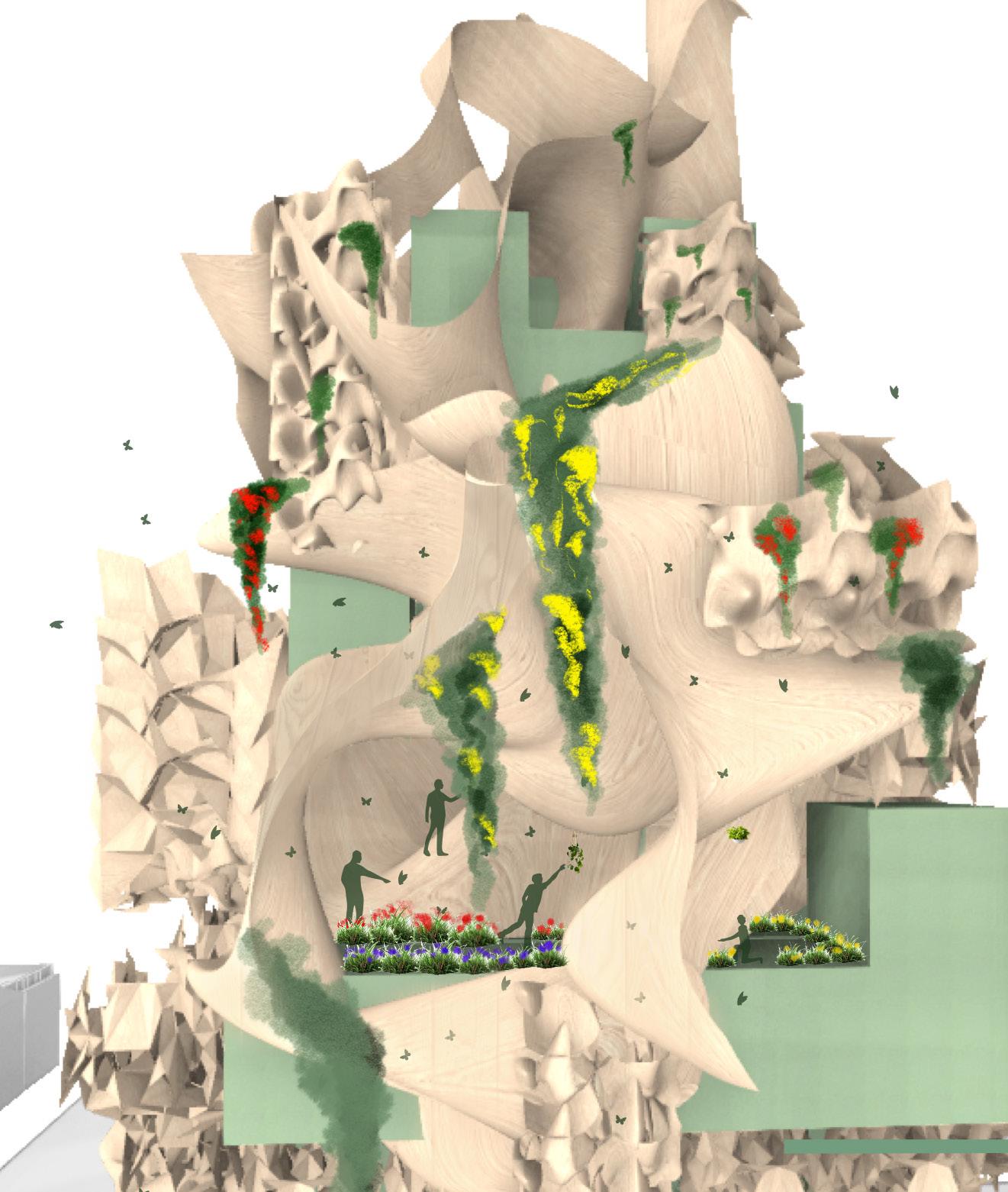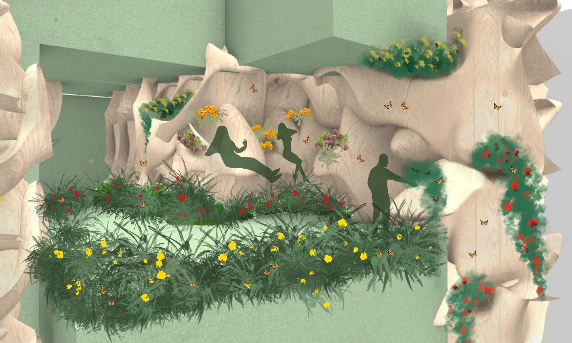 This 3D perspective demonstrated that the visiors are relaxing on the living envelope and interacting with the butteries in the outdoor garden