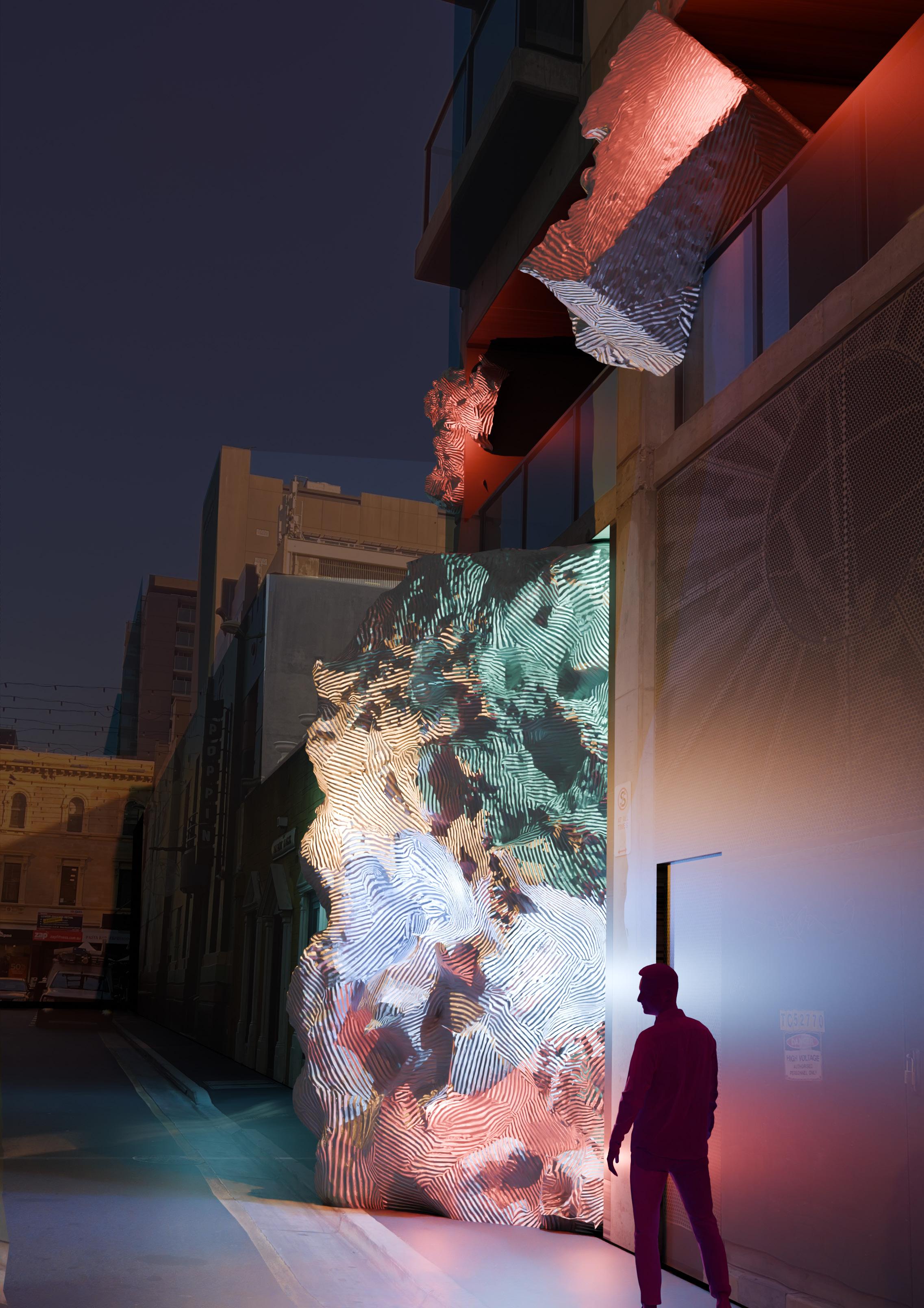 Then I produce 6 renders of the physical models. Synagogue Place was chosen to be the site in the Adelaide CBD. I then create a series of visualisations of the physical models and the site using Blender in order to produce the renders and elevations.