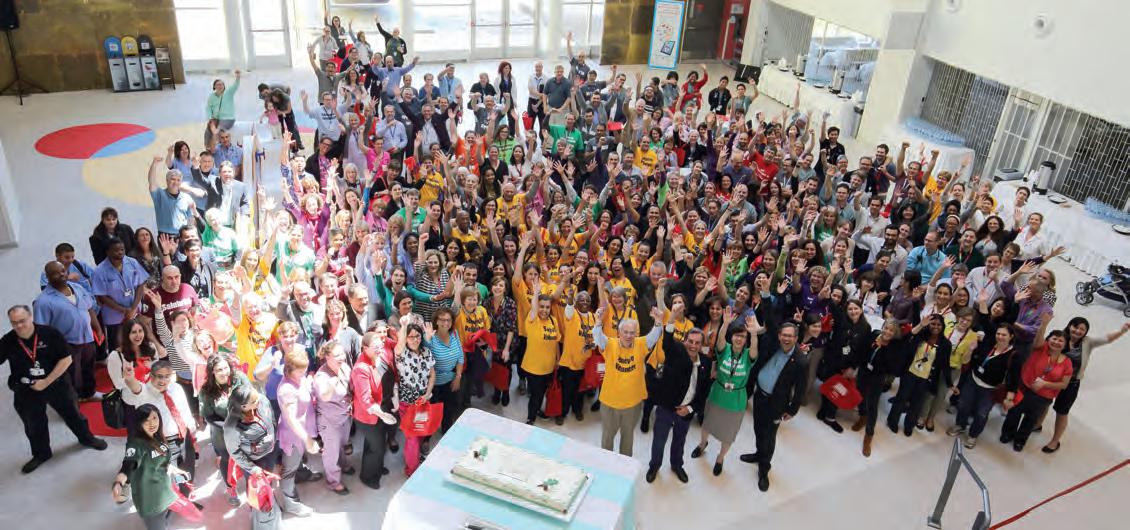 u Volunteers and staff gather in the P.K. Subban Atrium to celebrate the completion of the move to the Glen site.