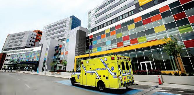 u An ambulance carrying patients arrives at the main entrance of the new Montreal Children’s Hospital.