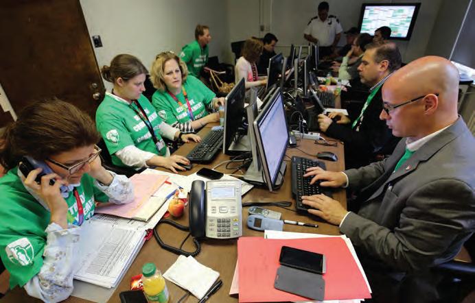 u Staff and volunteers gather in the auditorium of the former hospital to coordinate the various stages of the move.