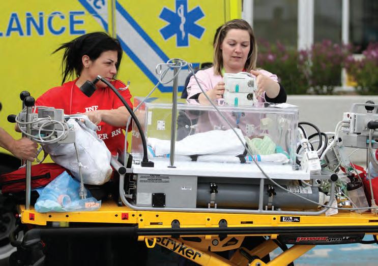 A baby ready to be transported by ambulance is accompanied by two medical staff members.
