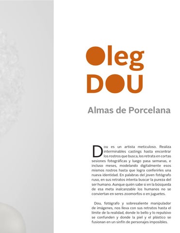 ou es un artista meticuloso. Realiza interminables castings hasta encontrar los rostros que busca, los retrata en cortas sesiones fotográficas y luego pasa semanas, e incluso meses, modelando digitalmente esos mismos rostros hasta que logra conferirles una nueva identidad. En palabras del joven fotógrafo ruso, en sus retratos intenta buscar la pureza del ser humano. Aunque quién sabe si en la búsqueda de esa meta inalcanzable los humanos no se conviertan en seres zoomorfos o en juguetes. Dou, fotógrafo y sobresaliente manipulador de imágenes, nos lleva con sus retratos hasta el límite de la realidad, donde lo bello y lo repulsivo se confunden y donde la piel y el plástico se fusionan en un sinfín de personajes imposibles.