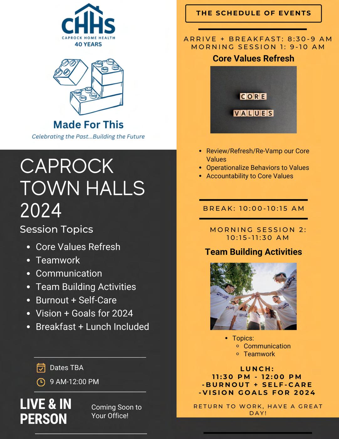 Since not everyone could attend the 2-day Caprock Leadership Summit, we are bringing a condensed version to your parent office in the form of a Town Hall format over the coming weeks. This time will be filled with a lot of the same activities we did at the Summit, just in a shortened manner. We will be refreshing our Core Values further and the first hour of the Town Hall will be to allow you to weigh-in on our Core Values so that you can go “all in” on them! We look forward to seeing each of you soon as we visit our Caprock parent offices across Texas.