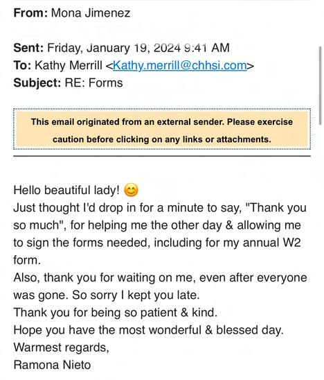 A: I started as a Clerk. I’ve been a Print Clerk now for 10 years. I’ve done a little bit of everything. They put me in a medical transcriptionist role because our nurses used voice recorders. I’d type it all out. They eventually moved to professional transcriptionists. I then became a Medicare Clerk, sent out MD orders, fixed charts, etc. I then went to Payroll for a few years, and then CBA Clerk, where I ordered medical supplies. Then, to Receptionist, then Payroll again. Then, I’ve done provider work, also. I’d take care of clients when the provider didn’t show up, especially the priority clients that couldn’t miss having someone there with them. Then, I became an Attendant Recruiter and moved from the Knoxville store to our current corporate office location. I’ve seen all the Morales children grown. I’ve also gone to several of our branch offices to help with moving and set-up, along with filing.