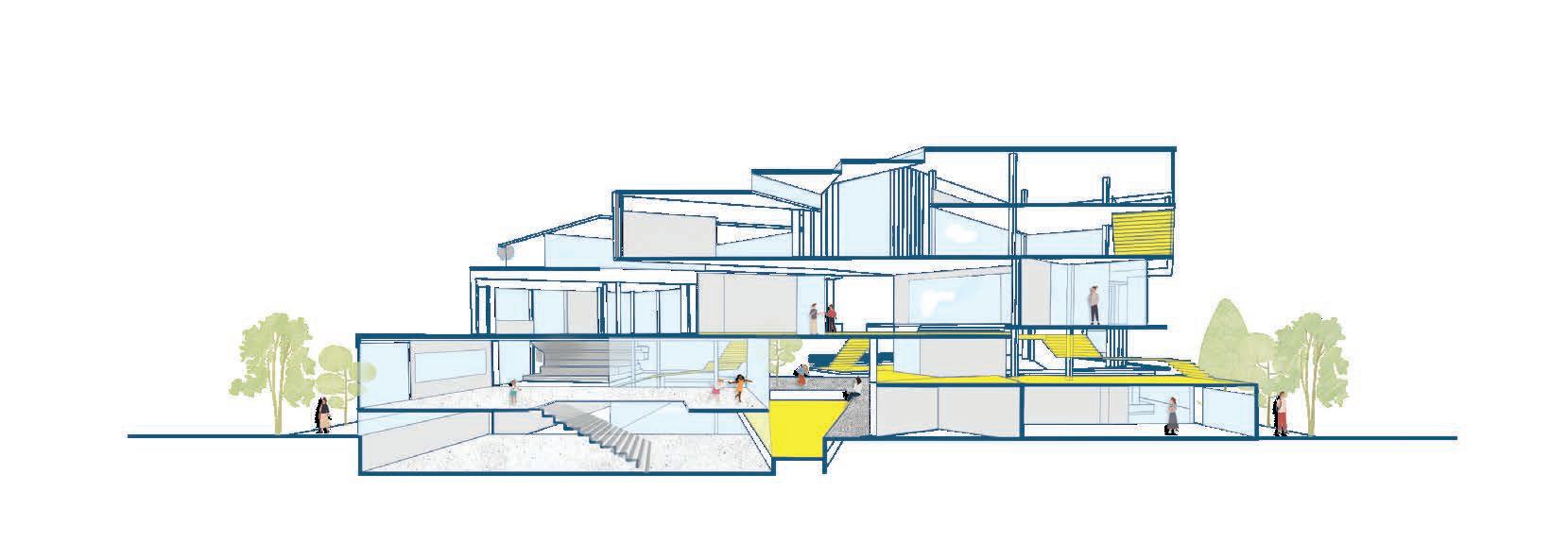 The incorporation of outdoor spaces at each level also serves to provide opportunities for interaction among visitors. The di erent areas of the building can be used for a variety of activities, such as meetings, events, or outdoor exhibitions, which can be easily accessed by visitors using the outdoor stairs and platforms.