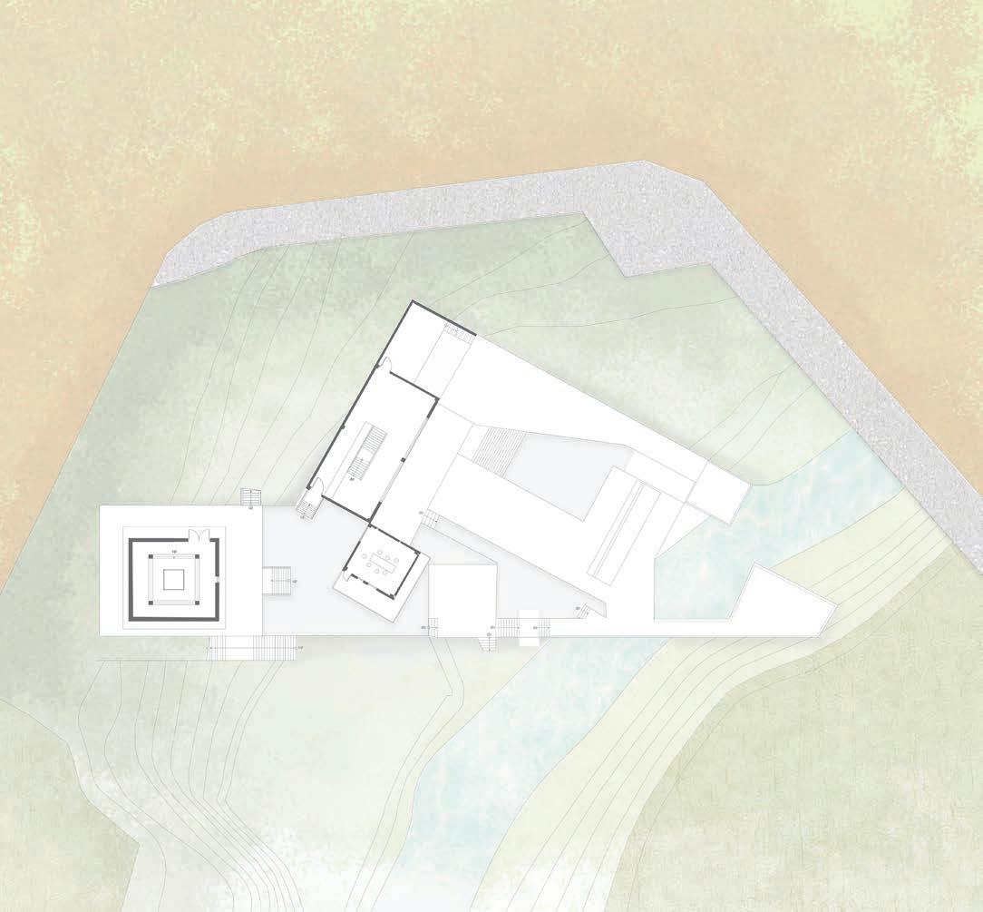 To ensure harmonious integration with the natural terrain, I adopted a design approach that involved situating the building volumes in a manner that is sensitive to the topography. A portion of the structure was placed underground and concealed with vegetation, seamlessly blending it with