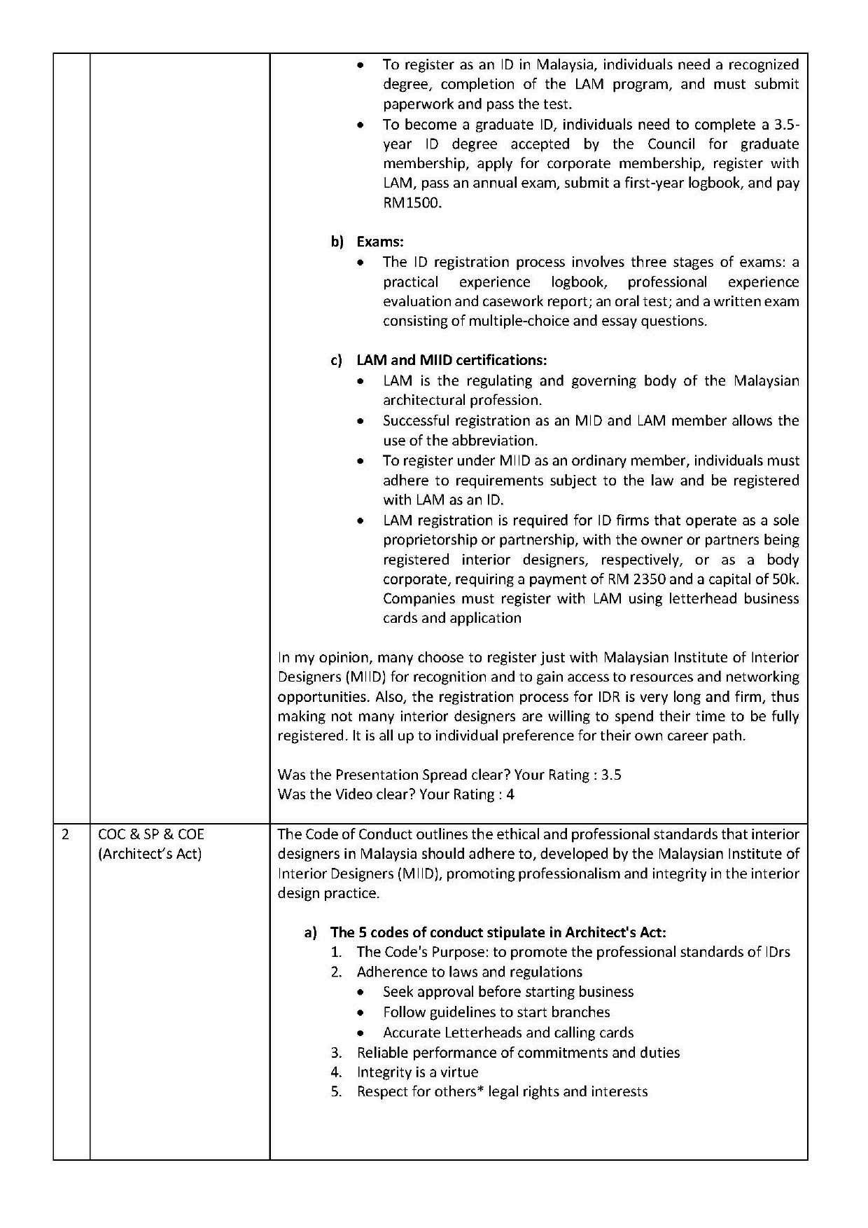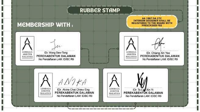 In this assignment, as future Graduate Interior Designers, students will explore the professional conduct and practice standards expected of Interior Designers registered with the Board of Architects in Malaysia. Students will reference legal and regulatory documents such as the Architects Act 1967, Architects Rules 1996, Uniform Building By-Laws 1984, PAM/MID Contract, and other pertinent provisions.
