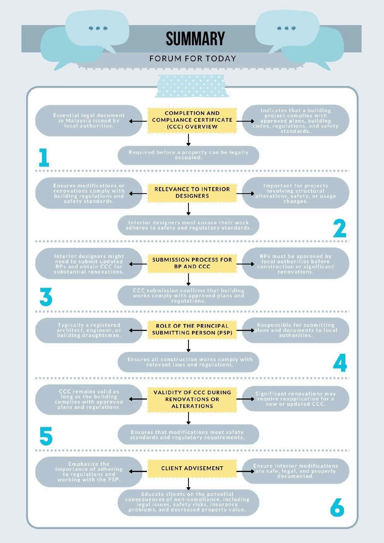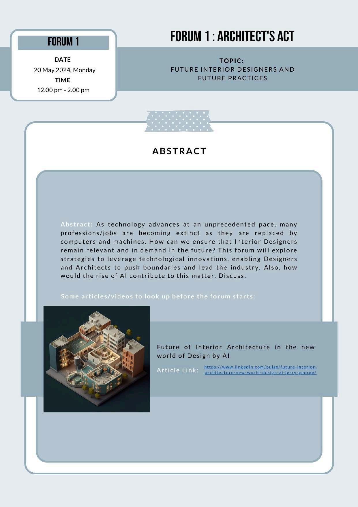 Attending a series of forums and seminars provided a comprehensive learning experience on a wide range of topics. In the forums, we learned strategies for leveraging technological innovations and AI to ensure interior designers remain relevant and lead the industry in the future, discovered the significance of CCCs for interior designers in Malaysia, including the process, PSP's role, and considerations for renovations, vital for advising clients on compliance and safety, and learned to improve Malaysia's UBBL 1984 for better fire safety and understand its critical relevance to interior design beyond architecture.
