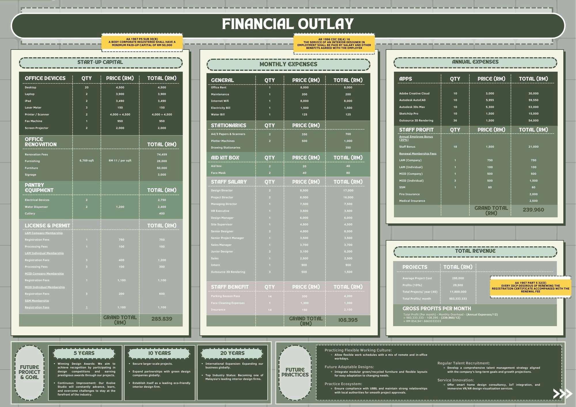 In crafting the vision and mission of J&W Interior Design Sdn. Bhd., our focus was on addressing contemporary challenges while fostering mutual benefits for ourselves and the community. We aimed to establish a company that would positively impact society, the environment, and the economy. To achieve this, we deliberated specializing in areas such as sustainable design, adaptive reuse, or wellness-centric spaces to carve a niche in the market. An integral aspect of our project was meticulous financial planning. Through forecasting capital, income, and expenditures, we gained invaluable insights into the financial viability of launching and sustaining J&W Interior Design Sdn. Bhd.. This process ensured the company's long-term resilience and efficient resource management.