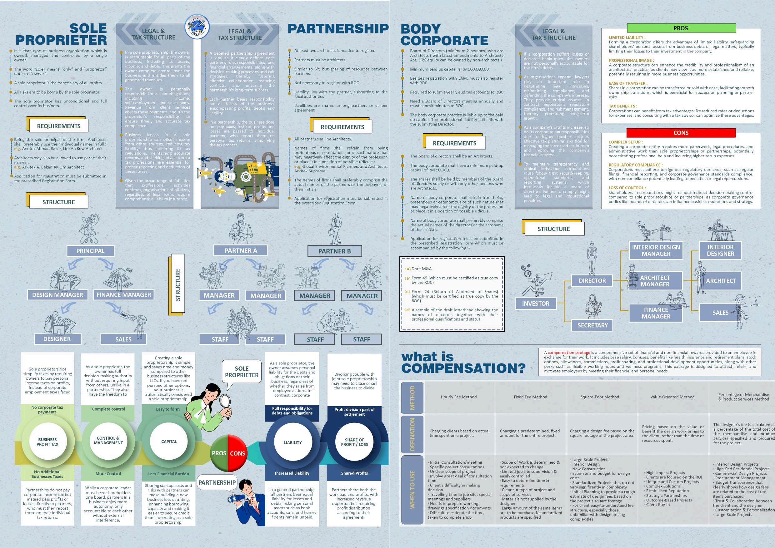 In this project, my group focused on the Forms of Practice under the Architect’s Act, specifically exploring Sole Proprietorship, Partnership, and Body Corporate. Our group consisted of three members: Alvira Chai Chiew Eng, Lim Xin Yi, and myself. We divided our tasks accordingly; I was mainly in charge of designing the presentation spread, which consisted of four A3-sized pages in Photoshop, while my groupmates conducted the research.
