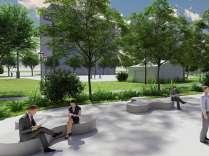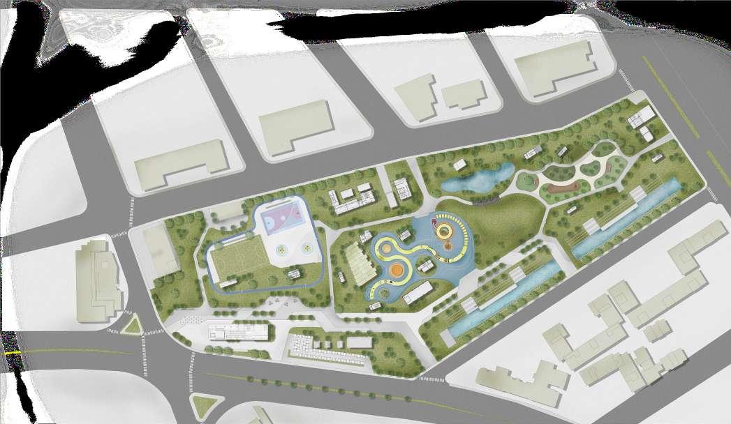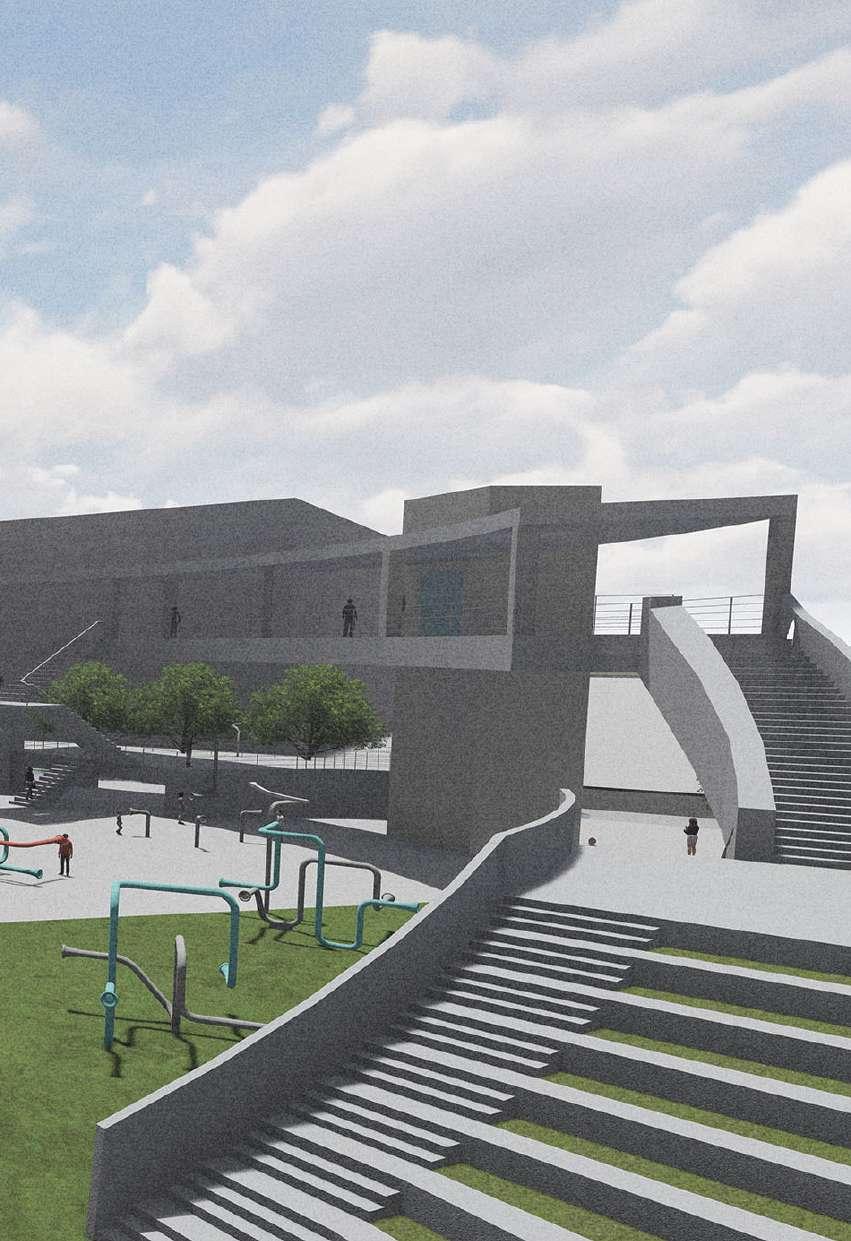 使用年輕活潑的色彩作為鋪面,結合綠化屋頂作為休息看台
