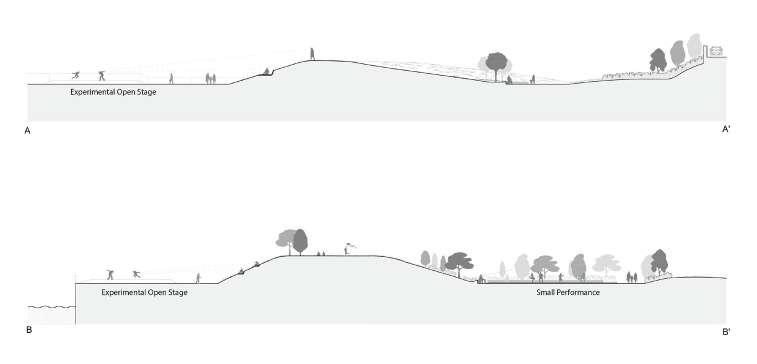 北側的彈性滯洪草皮深4公尺,晴天時提供聚集、活動之功能,雨天時收集周邊下沉綠地的雨水,延緩洪峰。 南側的滯洪池為都市景觀導向,除了維持1.5m之常水位,另亦增設平台及高架木棧道提供人們穿梭水域的體驗。