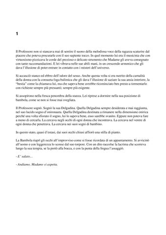 Il Professore non si stancava mai di sentire il suono della melodiosa voce della ragazza scaturire dal piacere che poteva procurarle con il suo sapiente tocco. In quel momento lui era il musicista che con virtuosismo pizzicava le corde del prezioso e delicato strumento che Madame gli aveva consegnato con tante raccomandazioni. E lei vibrava nelle sue abili mani, in un crescendo armonico che gli dava l’illusione di poter entrare in contatto con i misteri dell’universo. Si accasciò stanco ed ebbro dell’odore del sesso. Anche questa volta si era nutrito della carnalità della donna con la consueta foga bulimica che gli dava l’illusione di saziare la sua ansia interiore, la “bestia” come la chiamava lui, ma che sapeva bene avrebbe ricominciato ben presto a tormentarlo con richieste sempre più pressanti; sempre più esigente. Si assopirono nella fresca penombra della stanza. Lei riprese a dormire nella sua posizione di bambola, come se non si fosse mai svegliata. Il Professore sognò. Sognò la sua Delgadina. Quella Delgadina sempre desiderata e mai raggiunta, nel suo lucido sogno d’onironauta. Quella Delgadina destinata a rimanere nella dimensione onirica perché una volta sfiorato il sogno, lui lo sapeva bene, esso sarebbe svanito. Eppure non poteva fare a meno di cercarla. La cercava negli occhi di ogni donna che incontrava. La cercava nel ventre di ogni donna che penetrava. La cercava nei suoi sogni di bambino. In questo stato, quasi d’estasi, dai suoi occhi chiusi affiorò una stilla di pianto. La Bambola riaprì gli occhi all’improvviso come si fosse ricordata di un appuntamento. Si avvicinò all’uomo e con leggerezza lo scosse dal suo torpore. Con un dito raccolse la lacrima che scorreva lungo la sua tempia, se la portò alla bocca, e con la punta della lingua l’assaggiò. E’ salato… Andiamo, Madame ci aspetta.