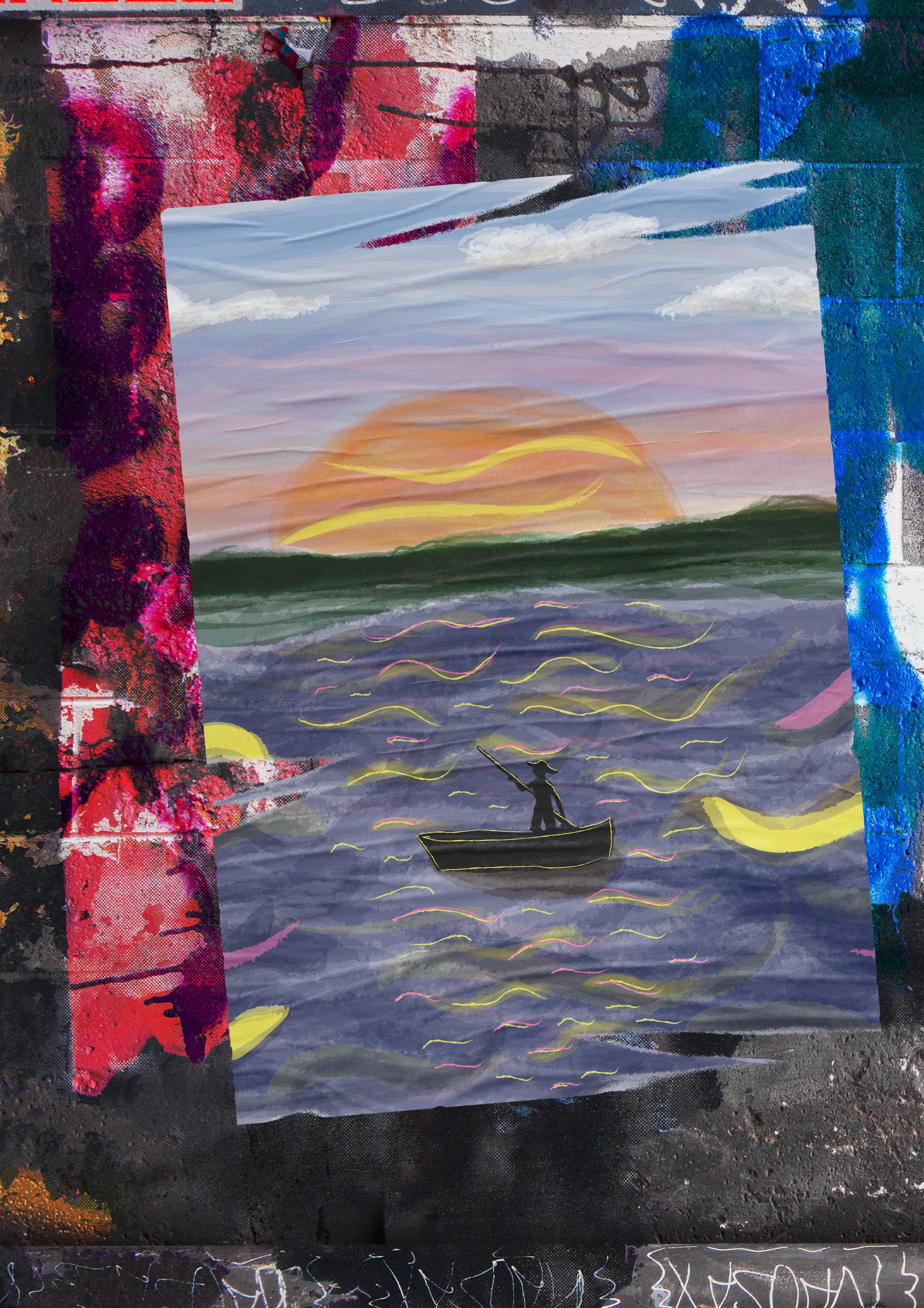caminho de volta para sentimentos tão densos, seja por minutos ou anos. Eu vejo um turbilhão, um emaranhado, o céu cair e refletir na travessia dos rios, mas quando escrevo sobre a falta que me dói, por alguns minutos minhas vivências bailam num palco de papéis enquanto performo escrevendo. Faz um tempo que estou em viagem, conheci muitos corpos e me cerquei d’outros organismos, entretanto, todos carregam lados sombrios dos quais precisamos atravessar, decifrálos, para assim, passar por eles. Também quer dizer fazer escolhas. Nessa viagem sempre tive muito medo de atravessar, e em um desses atravessamentos meu corpo dançou com os cardumes.