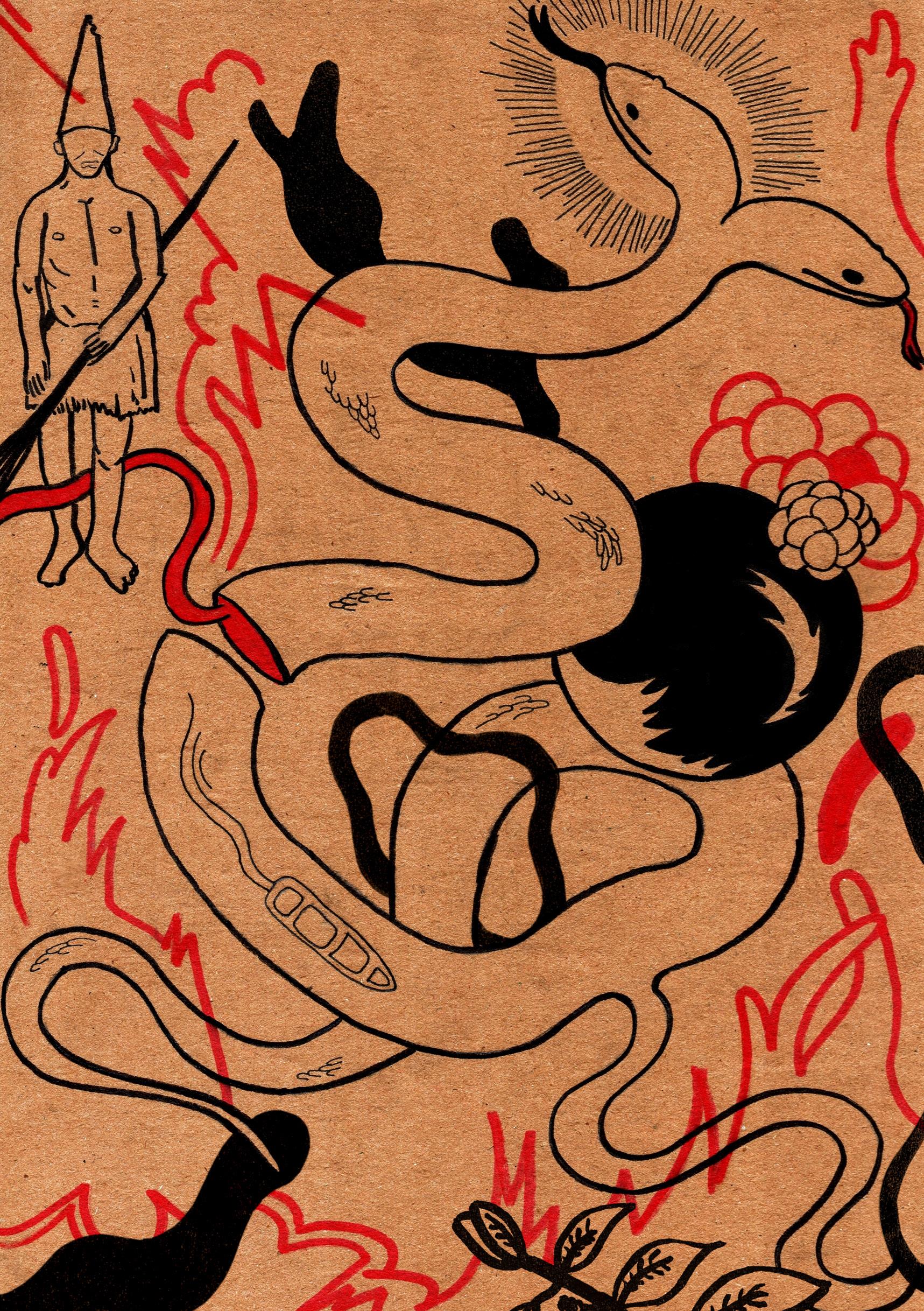 Em uma das noites, vi meu corpo se transformar, quando dei por mim, já era metade bicho, metade gente, um corpo-mutante e estranho. Acordei e não era a mesma de sempre, a beira da minha rede pesava e esse mundo estava diferente, vi a presença híbrida de um corpo-serpente. Em seguida, eu dançava lentamente mas o vento e o movimento do rio que continuavam seu percurso normalmente, me davam a impressão de seguir passando muito rápido, os dias e as noites atravessaram por mim enquanto meu corpo se movia e dançava no próprio ritmo descompassado.