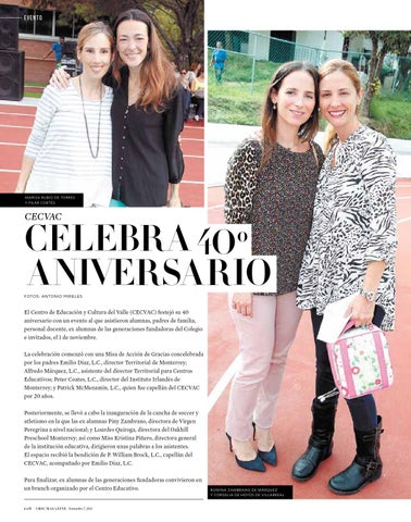 El Centro de Educación y Cultura del Valle (CECVAC) festejó su 40 aniversario con un evento al que asistieron alumnas, padres de familia, personal docente, ex alumnas de las generaciones fundadoras del Colegio e invitados, el 1 de noviembre. La celebración comenzó con una Misa de Acción de Gracias concelebrada por los padres Emilio Díaz, L.C., director Territorial de Monterrey; Alfredo Márquez, L.C., asistente del director Territorial para Centros Educativos; Peter Coates, L.C., director del Instituto Irlandés de Monterrey; y Patrick McMenamin, L.C., quien fue capellán del CECVAC por 20 años. Posteriormente, se llevó a cabo la inauguración de la cancha de soccer y atletismo en la que las ex alumnas Piny Zambrano, directora de Virgen Peregrina a nivel nacional; y Lourdes Quiroga, directora del Oakhill Preschool Monterrey; así como Miss Kristina Piñero, directora general de la institución educativa, dirigieron unas palabras a los asistentes. El espacio recibió la bendición de P. William Brock, L.C., capellán del CECVAC, acompañado por Emilio Díaz, L.C. Para finalizar, ex alumnas de las generaciones fundadoras convivieron en un brunch organizado por el Centro Educativo. 106