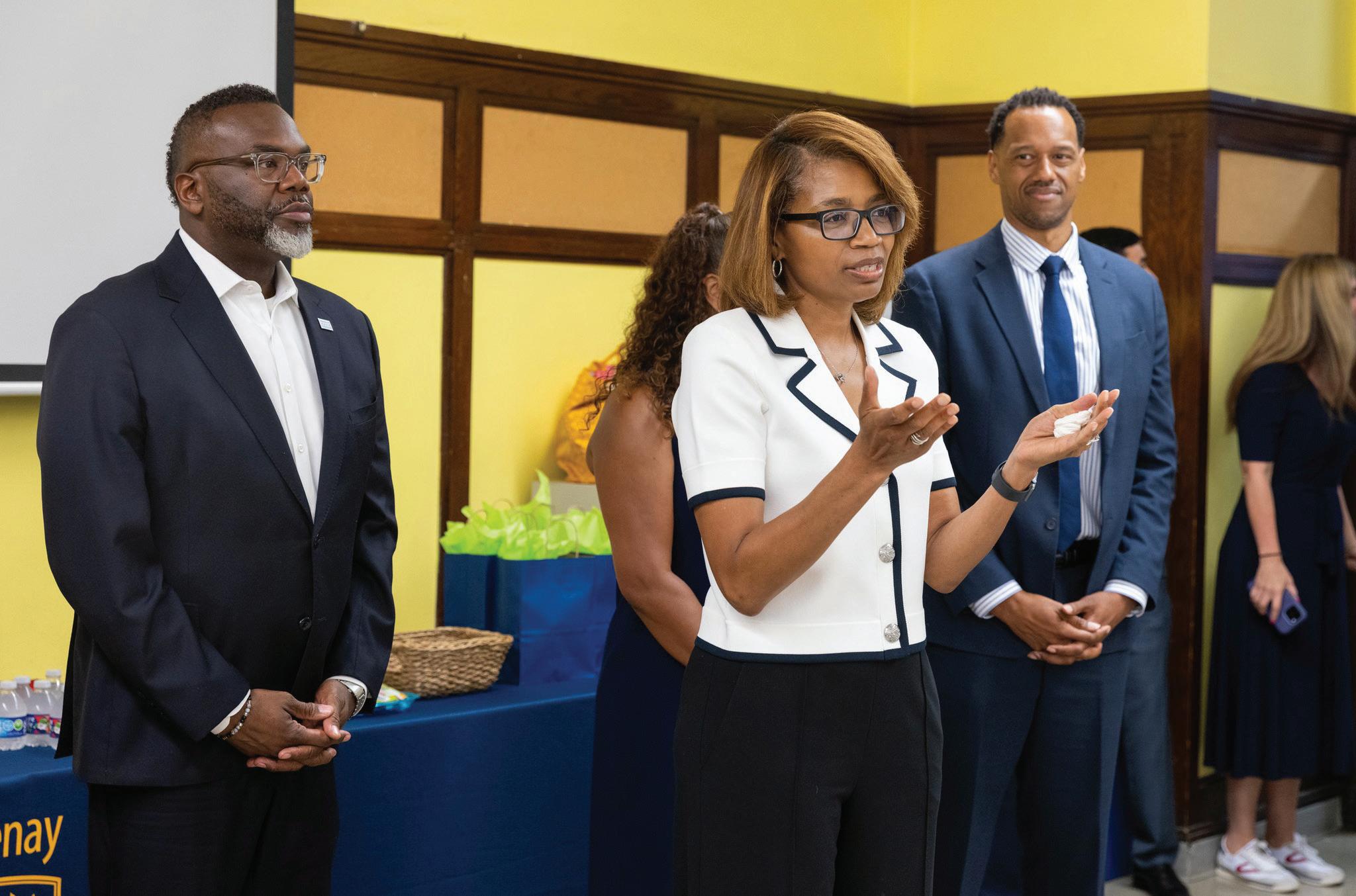 Dr. Macquline King speaks at the fi rst day of the 2025-2026 school year, alongside Mayor Brandon