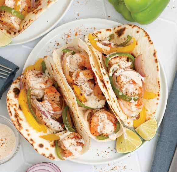 Divide tortillas between plates and fill with shrimp and veggies; drizzle with spicy ranch and serve with squeeze of lime.