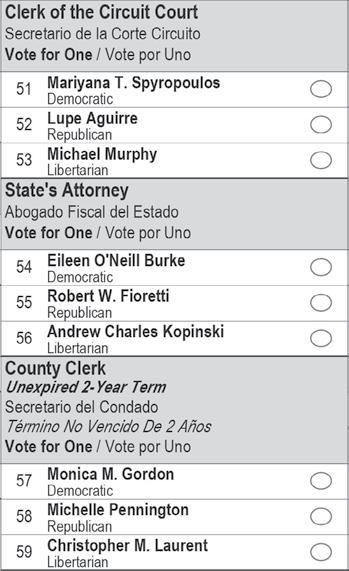 En la eleccion general los votantes votaran por los siguientes puestos y cuestiones de referendo. Referendos/Cuestiones de Política Pública serán votadas en aquellos precintos de Cook County bajo la jurisdicción del Cook County Clerk en la cual una unidad de gobierno local le ha pedido a la oficina del County Clerk que provea dicho referendo/cuestión de política pública en la boleta.