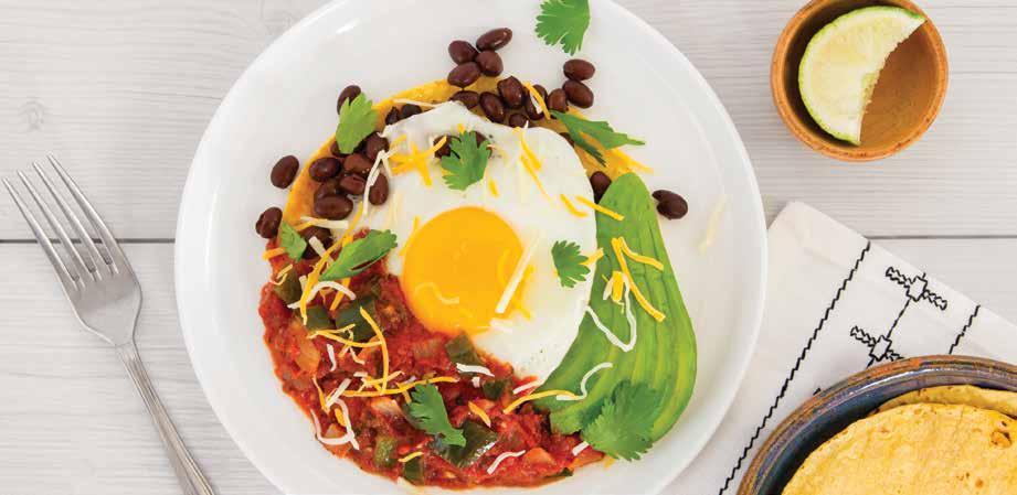 To make huevos rancheros: In medium nonstick skillet over medium heat, heat oil, swirling to coat bottom. Cook eggs 3-4 minutes, or until whites are set and edges are fully cooked. Place one tortilla on each plate. Top each tortilla with beans and one egg, being careful not to break yolk. Gently top each egg with warm salsa, cheese and avocado slices. Sprinkle each serving with cilantro and serve with lime wedge, if desired.