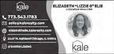 ATTENTION FREE GAS CARD WITH A AUTO & HOME INSURNACE QUOTE! CALL ALLSTATE AGENT HENRY BENJAMIN (773) 420-1669 BETWEEN 9-5 PM Monday-Friday We need information not hand-outs! CHATHAM & SOUTH END ONLY CLASSIFIED ELIZABETH “LIZZIE G” ELIE LICENSED REALTOR 773.543.1783 eelie@kalerealty.com elizabethelie.kalerealty.com 2447 N. Ashland Chicago, IL 60614 @SoldbyLizzieG