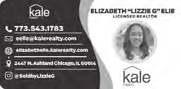 ELIZABETH “LIZZIE G” ELIE LICENSED REALTOR 773.543.1783 eelie@kalerealty.com elizabethelie.kalerealty.com 2447 N. Ashland Chicago, IL 60614 @SoldbyLizzieG