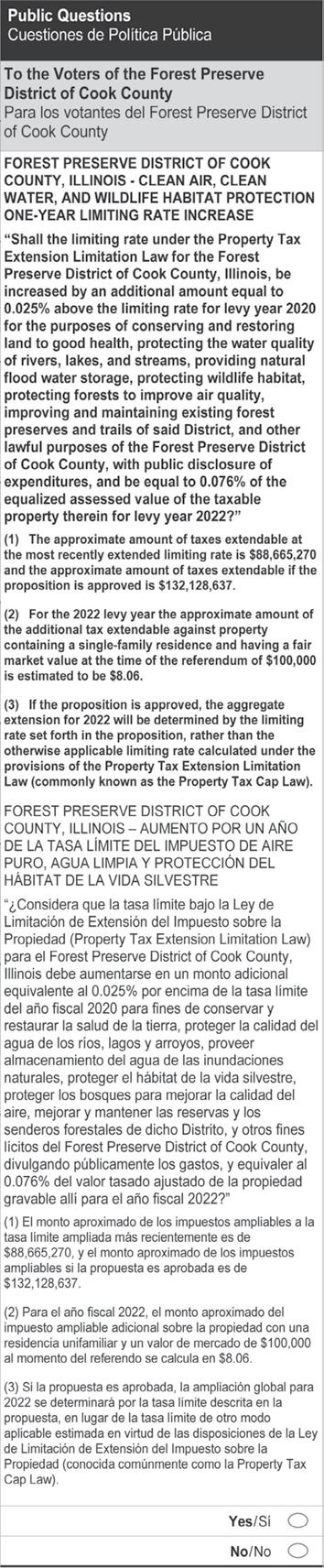At the General Election the voters will vote on the following contests and referenda questions. Referenda/Questions of Public Policy will be voted upon in those precincts of Cook County under the jurisdiction of the Cook County Clerk in which a Unit of Local Government has requested the County Clerk’s Office to place said referenda/questions of public policy on the ballot.
