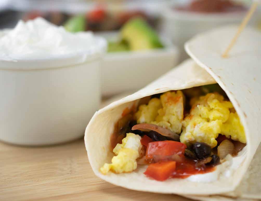 On a tortilla, spread sour cream, salsa, the bean mixture, scrambled eggs, tomatoes, avocado and hot sauce, if desired. Roll up the burrito and it’s ready to serve.