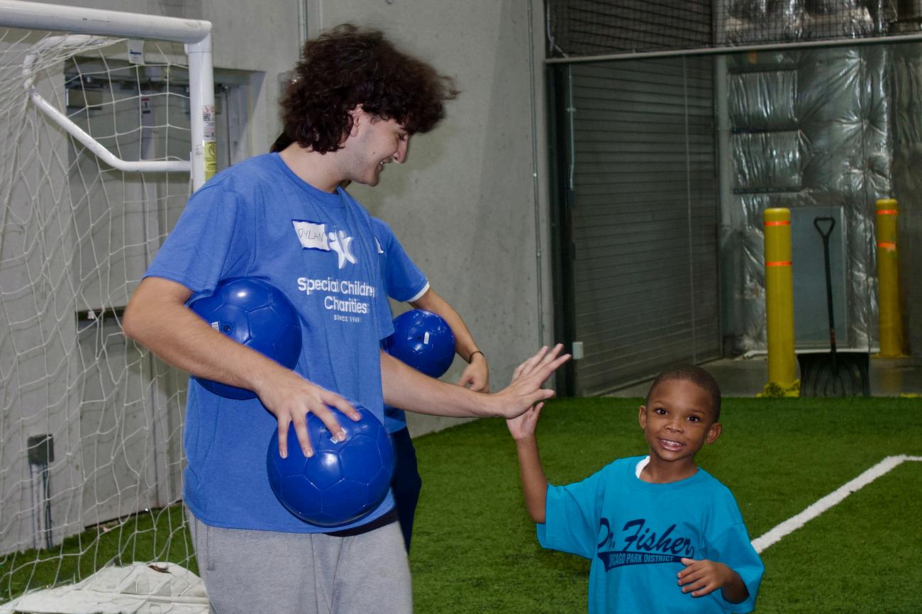 Senior Dylan Selagea cheers on a young athlete from Special Children’s Charities (formerly Special Olympics Chicago). Dylan is a captain of the Varsity Volleyball Team and plans to study Cyber Security in college.