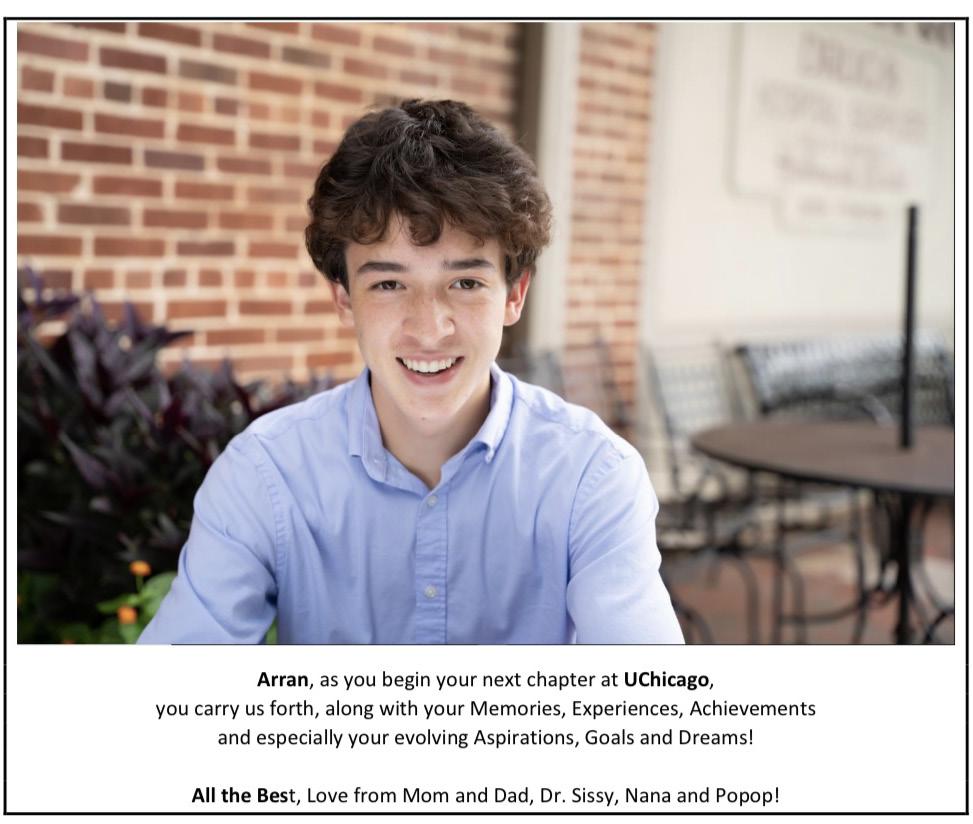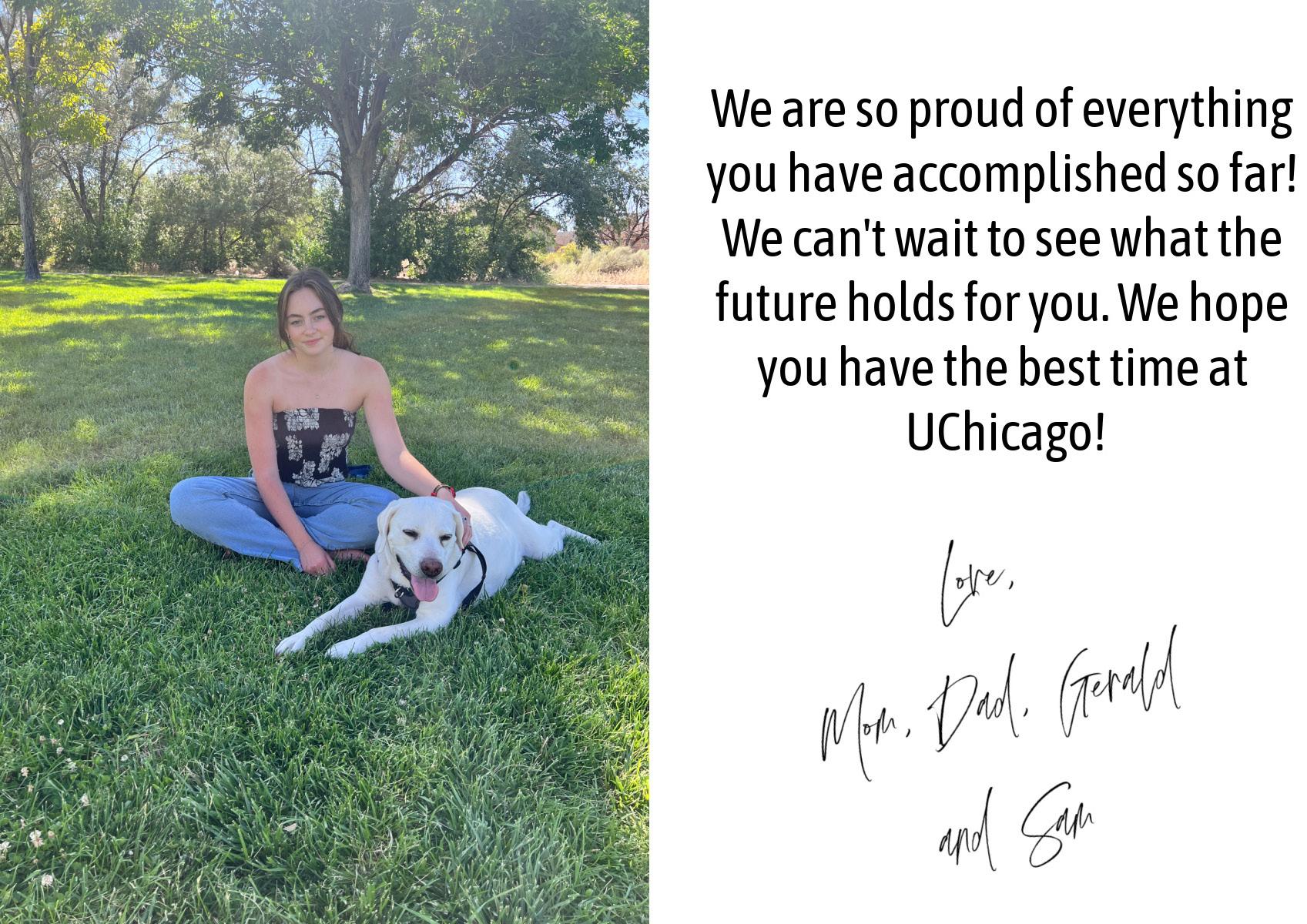 We are so happy for you and excited to hear about your new adventures at the University of Chicago! You always have all our love, Mommy, Daddy, Alexandra, Mitchell, Marin, & Finn :)