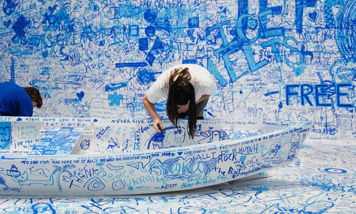 The last room, Add Color (Refugee Boat) (1960), already bears the marks of engagement. Viewers are asked to scribble their own messages in blue markers on the white—now mostly blue—walls. Many are scrawled political messages in response to the second presidency of Donald Trump, such that the piece recalls Ono and Lennon’s famous activism during the Vietnam War. Frenzied handwritten messages of “No Kings” and “Fuck ICE” color the walls. It is a sharp reminder of how, even today, Ono’s work blurs the line between museums and the outside world.