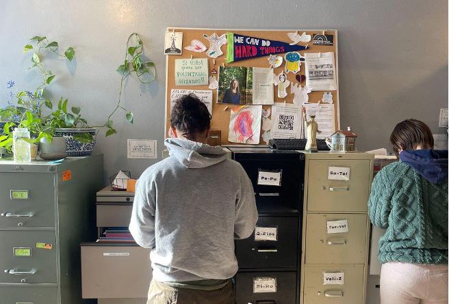 Volunteers at the legal aid clinic work beneath a bulletin board displaying a pennant that reads, “We can do hard things.” Graves asked that the South Side religious institution where the clinic operates remain unnamed because of the vulnerable legal status of her clients. celeste alcalay