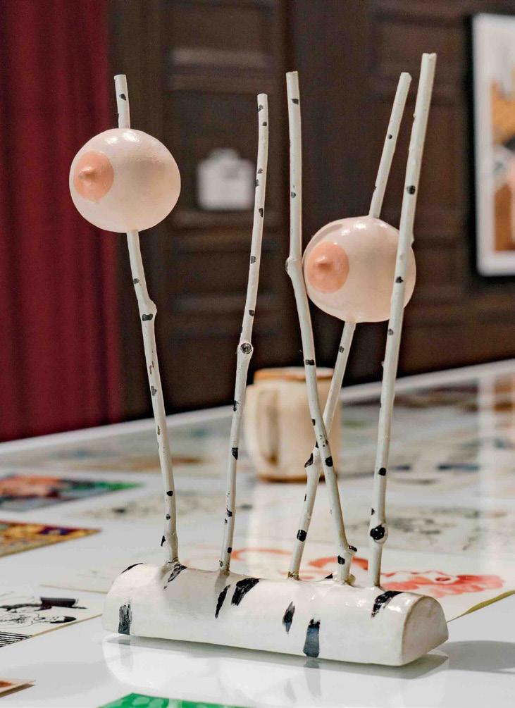 Zoya has responded in bold and brazen proportions. At the center of the exhibition, there is a large table with dozens of erotic drawings, sculptures, and found objects: a pair of surreal, ceramic spherical breasts impaled on a birch tree; an androgynous couple lying blissfully under a poster that reads “GLOBALIZE THE INTIFADA”; a drawing of a woman on a nude beach holding a sign proclaiming “YOU ARE HEADED FOR HELL!” surrounded by exuberant nudity and sex; and a recreation of Sylvia Sleigh’s The Turkish Bath (1973) with Zoya’s husband in the foreground.
