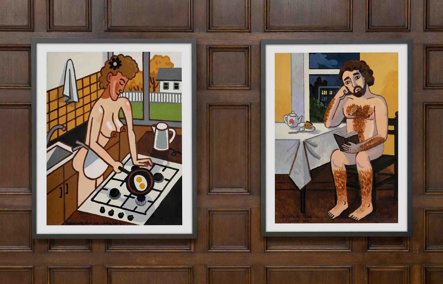 That isn’t to say there are no quieter, more reflective moments in the exhibition. In its cover painting, The Loner (2025), a naked man sits by a table with a book in his hand. He is not reading but looking directly at the viewer with a mournful, contemplative look in his eyes. It seems he has little desire to do anything. A tea cake sits untouched, its accompanying tea pot useless without a cup in sight. He is out of answers, and, with his head resting on his fist, he can do nothing but stare out at the viewer as if awaiting a response.