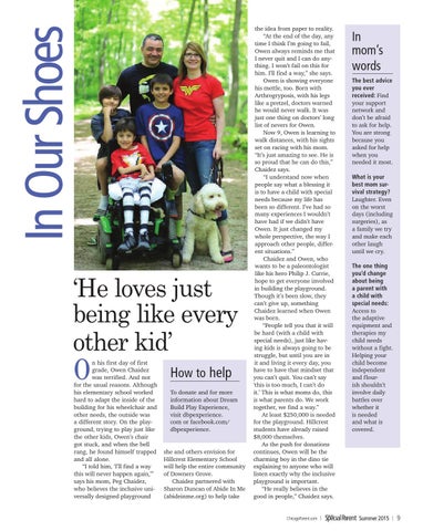 n his first day of first grade, Owen Chaidez was terrified. And not for the usual reasons. Although his elementary school worked hard to adapt the inside of the building for his wheelchair and other needs, the outside was a different story. On the playground, trying to play just like the other kids, Owen’s chair got stuck, and when the bell rang, he found himself trapped and all alone. “I told him, ‘I’ll find a way this will never happen again,’” says his mom, Peg Chaidez, who believes the inclusive universally designed playground