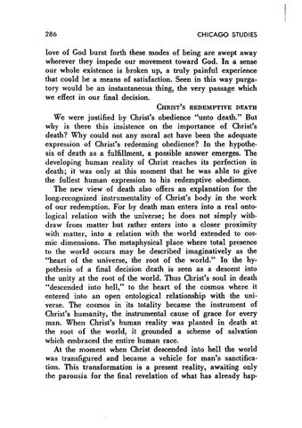 love of God burst forth these modes of being are swept away wherever they impede our movement toward God. In a sense our whole existence is broken up, a truly painful experience that could be a means of satisfaction. Seen in this way purga路 tory would be an instantaneous thing, the very passage which we effect in our final decision. CHRIST'S REDEMPTIVE DEATH