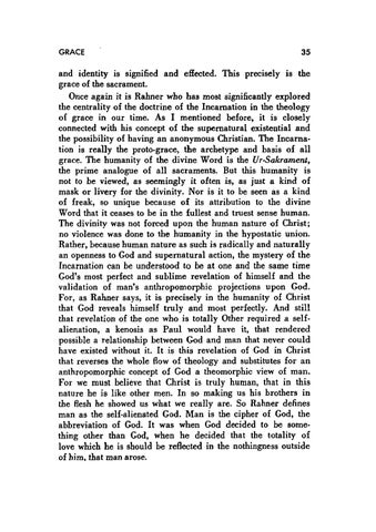and identity is signified and effected. This precisely is the grace of the sacrament. Once again it is Rahner who has most significantly explored the centrality of the doctrine of the Incarnation in the theology of grace in our time. As I mentioned before, it is closely connected with his concept of the supernatural existential and the possibility of having an anonymous Christian. The Incarnation is really the proto-grace, the archetype and basis of all grace. The humanity of the divine Word is the Ur-Sakrament, the prime analogue of all sacraments. But this humanity is not to be viewed, as seemingly it often is, as just a kind of mask or livery for the divinity. Nor is it to be seen as a kind of freak, so unique because of its attribution to the divine Word that it ceases to be in the fullest and truest sense human. The divinity was not forced upon the human nature of Christ; no violence was done to the humanity in the hypostatic union. Rather, because human nature as such is radically and naturally an openness to God and supernatural action, the mystery of the Incarnation can he understood to be at one and the same time God's most perfect and sublime revelation of himself and the validation of man's anthropomorphic projections upon God. For, as Rahner says, it is precisely in the humanity of Christ that God reveals himself truly and most perfectly. And still that revelation of the one who is totally Other required a selfalienation, a kenosis as Paul would have it, that rendered possible a relationship between God and man that never could have existed without it. It is this revelation of God in Christ that reverses the whole flow of theology and substitutes for an anthropomorphic concept of God a theomorphic view of man. For we must believe that Christ is truly human, that in this nature he is like other men. In so making us his brothers in the flesh he showed us what we really are. So Rahner defines man as the self-alienated God. Man is the cipher of God, the abbreviation of God. It was when God decided to be something other than God, when he decided that the totality of love which he is should he reflected in the nothingness outside of him, that man arose.