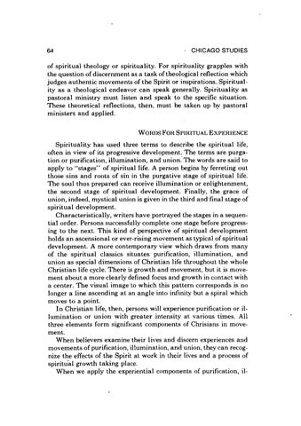 of spiritual theology or spirituality. For spirituality grapples with the question of discernment as a task of theological reflection which judges authentic movements of the Spirit or inspirations. Spirituality as a theological endeavor can speak generally. Spirituality as pastoral ministry must listen and speak to the specific situation. These theoretical reflections, then, must be taken up by pastoral ministers and applied. WORDS FOR SPIRITUAL EXPERIENCE