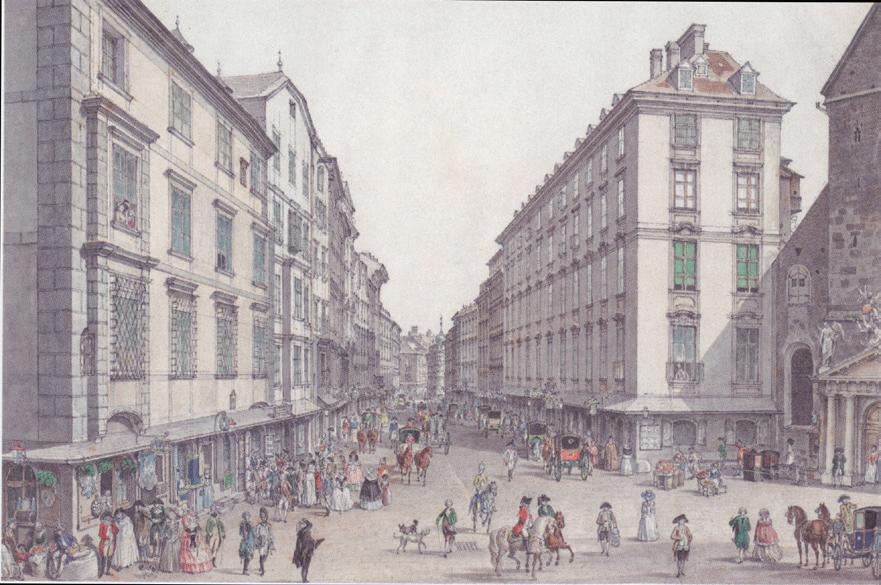 this page: Wolfgang Mozart, detail from the Mozart family portrait by Johann Nepomuk della Croce (1736–1819), 1780 | opposite page: The Kohlmarkt in Vienna, a drawing of a portion of the city center by Carl Schütz (1745–1800), 1786 | next spread: Richard Strauss, as photographed by Ferdinand Schmutzer (1870–1928), 1922. Austrian National Library, Image Archive, Austria