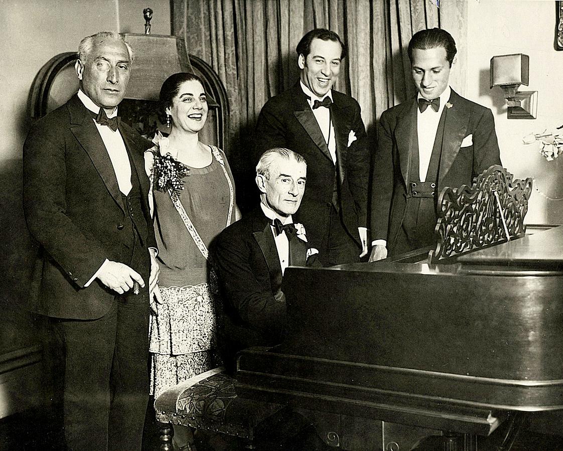 this page: Birthday party in honor of Maurice Ravel (1875–1937), New York City, March 8, 1928. Left to right, conductor Oskar Fried (1871–1941), mezzo-soprano and host Éva Gauthier (1885–1958), Ravel at the piano, composer-conductor Manoah Leide-Tedesco (1894–1982), and George Gershwin (at Ravel’s request)