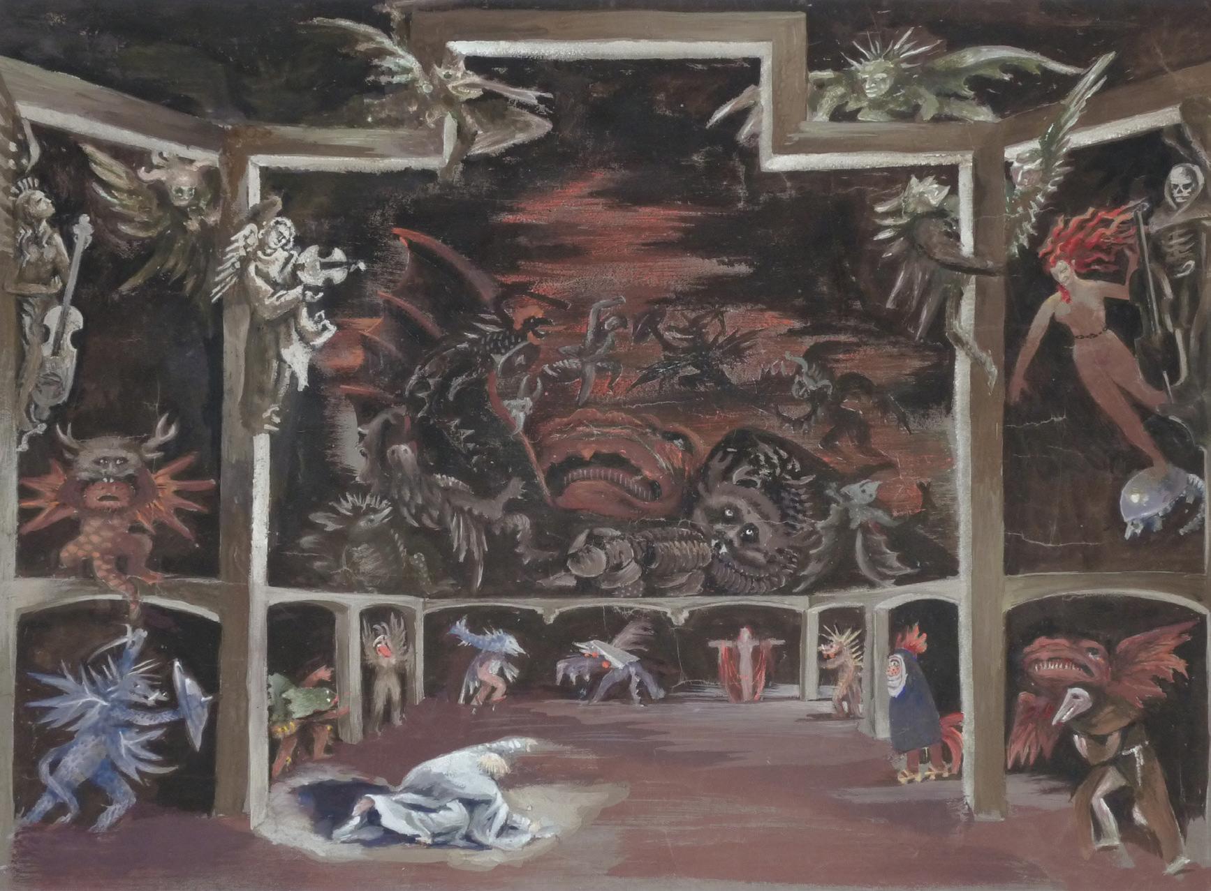 next spread: A stylized stage design by Helmut Jürgens (1902–1963) from a production of the opera Mathis der Maler, performed in Munich in 1948