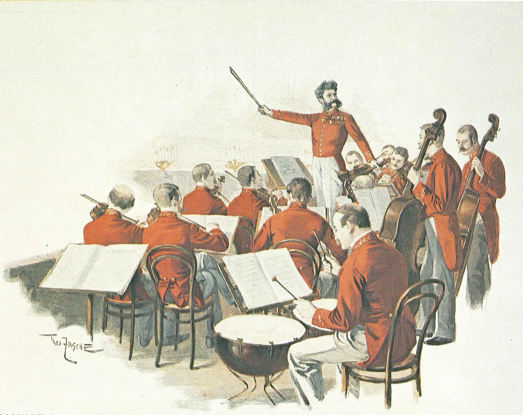 this page, from top : Johann Strauss, Jr., portrait by Fritz Luckhardt (1833–1894), 1899. Gallica Digital Library, Bibliothèque nationale de France, Paris | Adele (1856–1930) and Johann Strauss, Jr., at Bad Ischl, Austria, ca. 1895, as photographed by Rudolf Krziwanek (1843–1905). Austrian National Library, Vienna | opposite page: Johann Strauss, Jr., and His Band at the Court Ball. Print after a painting by Theo Zasche (1862–1922), 1888