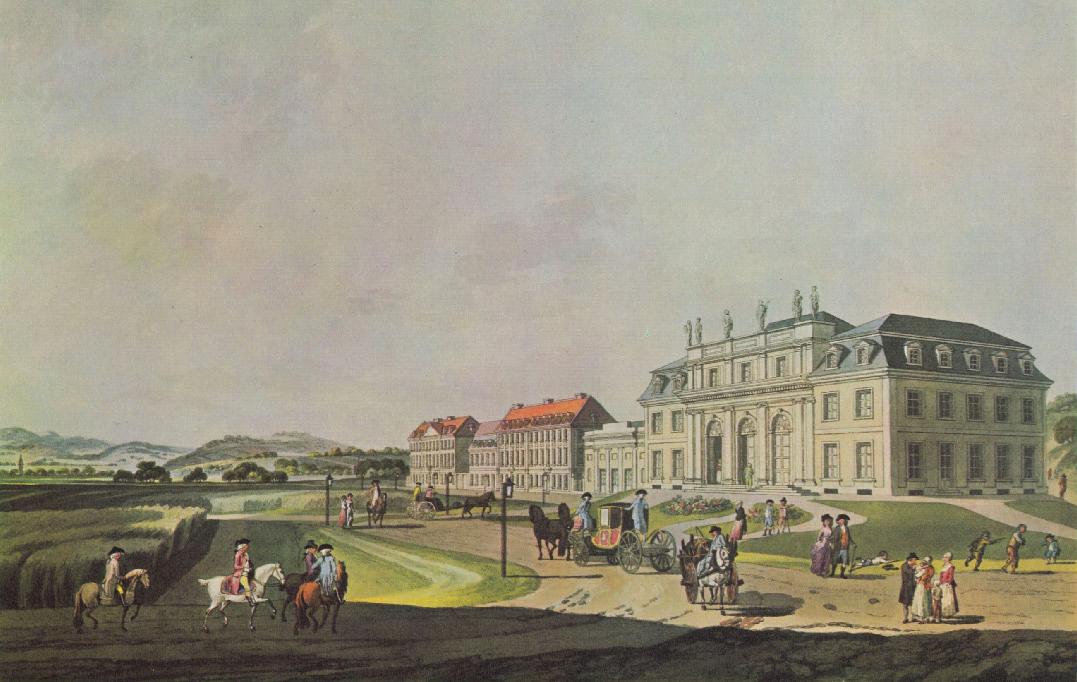 previous page, from top: Ludwig van Beethoven, copperplate engraving by Johann Joseph Neidl (1776–1832) after a lost portrait by Gandolph Ernst Stainhauser von Treuberg, (1766–1805), ca. 1800–01 | Redoute in Bonn–Bad Godesberg—opened in 1792 as a court ballroom and concert hall—where Beethoven performed as a member of the Bonn court orchestra and where he met Joseph Haydn in 1792 when Haydn was returning to Vienna after his first London trip. Copperplate engraving by Johann Ziegler (1749–1812) after a watercolor by Laurenz Janscha (1749–1812), 1792 | this page: A view of Vienna’s Michaelerplatz, ca. 1780s, including St. Michael’s Church, the Imperial Riding School, a domed wing of the Hofburg Palace, and the Imperial National Theatre (old Burgtheater) on the right, where Beethoven premiered his Piano Concerto no. 2 at a charity concert on March 29, 1795. Etching by Carl Schütz (1745–1800). Published by Artaria & Co., Vienna, Austria