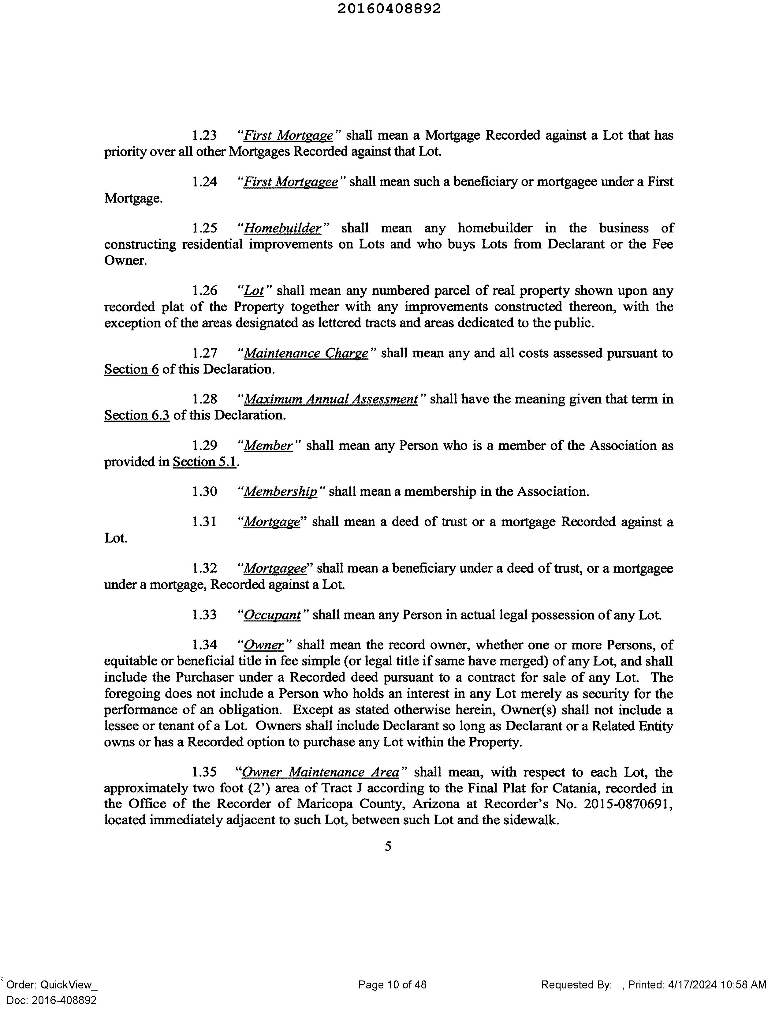 Subject Property Location Report Date: 04/17/2024 Property Address 6948 N 86TH LN Order ID: R145811480 City, State & Zip GLENDALE, AZ 85305-2122 County MARICOPA COUNTY Property Use Single Family Residential Mailing Address 6948 N 86TH LN, GLENDALE, AZ 85305-2122 Parcel Number 102-03-645 Census Tract 0927.10 Latitude 33.536775 Thomas Bros Pg-Grid Longitude -112.246015 Legal Description Details Lot Number: 15 Subdivision Name: CATANIA Sec/Twn/Rng/Mer: SEC 10 TWN 2N RNG 1E Brief Description: CATANIA MCR 1252-24 Recorder's Map Ref: MB 125224 Current Ownership Information *Source of Ownership data: Assessment Data Primary Owner Name(s) COLLINS HERBERT & DIANE Vesting Latest Full Sale Information Primary Owner Name(s) K HOVNANIAN AT CATANIA LLC, Sale Price $129,469 Sale Date 01/09/2017 Recording Date 01/09/2017 Vesting Recorder Doc # 2017-0015934 Book/Page Financing Details at Time of Purchase No financing details available Property Characteristics Bedrooms Year Built 2017 Living Area (SF) 3,075 Bathrooms/Partial 4 Garage/No. of Cars Garage/2 Price ($/SF) $42/SF Total Rooms Stories/Floors 2 Stories Lot Size (SF/AC) 6,067/.14 Construction Type Frame No. of Units Fireplace Exterior Walls Stucco No. of Buildings Pool Roof Material/Type Concrete tile Basement Type/Area Heat Type Yes Foundation Type Style A/C Refrigeration Property Type Residential View Elevator Land Use Single Family Residential Zoning Assessment & Taxes Assessment Year 2024 Tax Year 2023 Tax Exemption Total Assessed Value $51,320 Tax Amount $3,887.80 Tax Rate Area 920700 Land Value Tax Account ID Improvement Value Tax Status Improvement Ratio Delinquent Tax Year Total Value $513,200 Market Improvement Value $410,600 Market Land Value $102,600 Market Value Year 2024 Lien History Trans. ID Recording Date Lender Amount Purchase Money 1 07/21/2020 COMMERCE HOME MORTGAGE LLC $355,787 NO 2 11/07/2017 LOW VA RATES LLC $362,285 NO 3 04/14/2017 ACADEMY MORTGAGE CORP $350,363 NO Loan Officer Insights No details available
