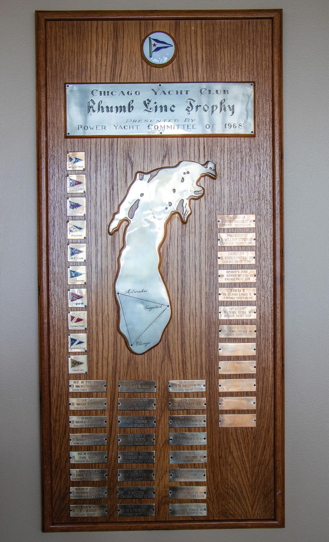 The Rumb Line Trophy was also established in 1963 for the winner of a three-legged race, Chicago to Saugatuck, Michigan, Saugatuck to Milwaukee, and Milwaukee back to Chicago. At over 300 miles long, it was the longest fresh water predicted log contest. It was listed as a “men only” race. Through the years, these contestants battled dense fog, 84 mph winds and seas that would turn any stomach.